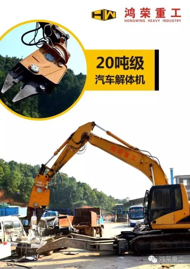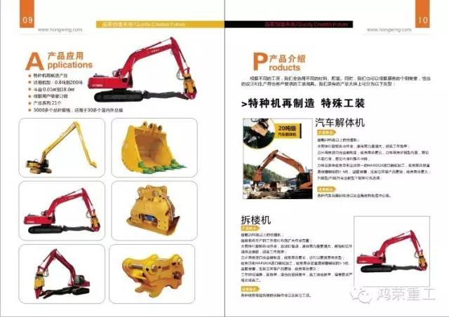 鴻榮重工的產品現分為特種機再制造、特殊工裝以及工程機械的工裝屬具。?其中特種機再制造及特殊工裝包括:再制造二手挖掘機整機,使用大型特殊工裝如:加長臂,三節臂,巖石臂,液壓破碎剪,汽車拆解剪,伸縮臂等使挖掘機功能得到進一步提升,適用工況包括各種汽車拆解回收中心,金屬廢料處理中心;噪音要求嚴格的樓房及高層建筑拆除工地;基坑,陡坡挖掘;地鐵,隧道挖掘;基礎深挖,深坑或者高空作業;溝渠清淤,河道疏通;中風化石,強風化巖石惡劣條件的挖掘施工等。